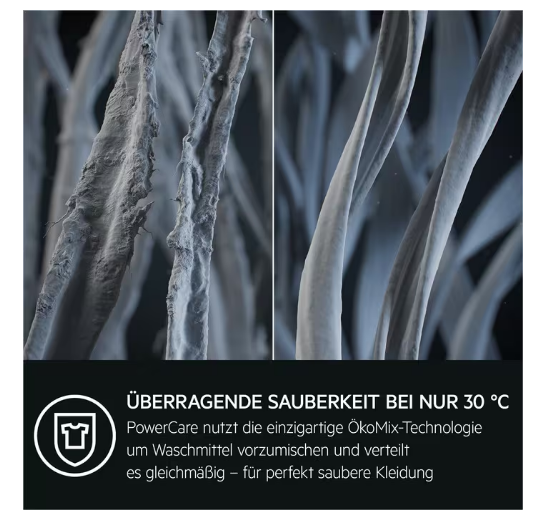 Die 8000 PowerCare Waschmaschinen verwenden die einzigartige PowerCare-Technologie, um Waschmittel und Weichspüler effektiv mit Wasser vorzumischen und gleichmäßig auf deiner Kleidung zu verteilen. Aktivierende Waschkraft bereits bei 30 °C für überragende Waschergebnisse in weniger als einer Stunde.