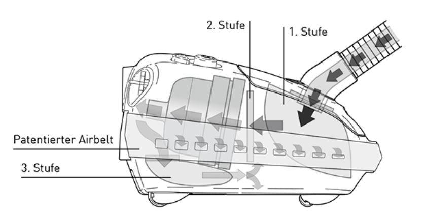 Der SEBO AIRBELT E ist serienmäßig mit einem dreistufigen S-Klasse Filtersystem ausgestattet und erzielt nachweislich hervorragende Filterergebnisse.