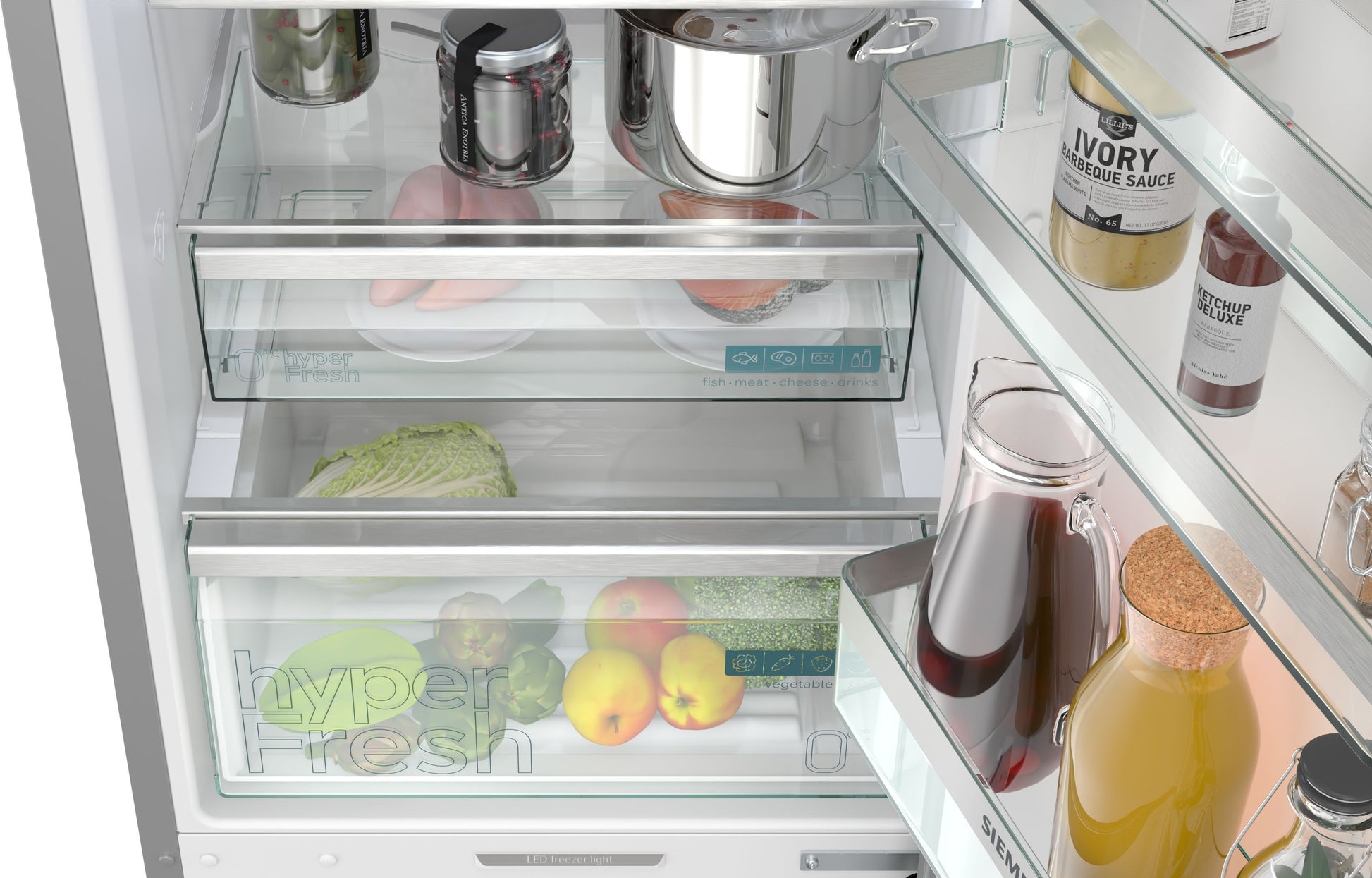 Erlebe mit der hyperFresh 0°C-Technologie höchsten Lagerstandard. Mit zwei separaten Schubladen bietet es viel Platz, um große Mengen an Gemüse, Fleisch und Fisch zu lagern, während die Temperatur knapp über 0 °C gehalten wird. Durch den optimalen Feuchtigkeitsgehalt hält die Gemüse-Schublade deine Lebensmitel länger frisch. Profitiere von den idealen Bedingungen, die Geschmack, Qualität und Nährwert erhalten, um sicherzustellen, dass du den besten Geschmack deiner Zutaten genießen kannst.