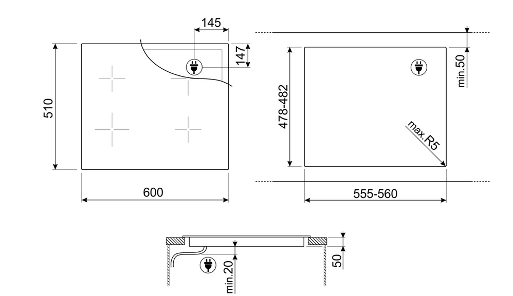 Ausschnittmass: 478-482x555-560 mmFunktion MultiZoneFlexible Kochzone: MultiZoneTimer mit Endabschaltung: 4Option PauseTimer/MinutenzählerAkustisches Signal bei GarzeitendeRestzeitanzeigeEco-Logic - Reduzierung der AnschlussleistungKochzonen